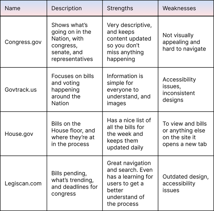 By conducting this analysis I not only got to see what competitors are creating for the users, I also got to have a better understanding of how the United States government works. It was a wonderful learning experience and sparked new ideas for me to add to Civic Pulse.