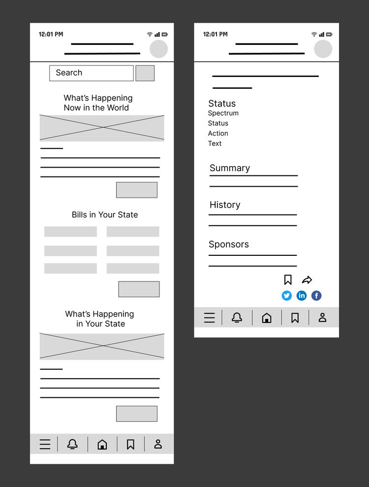 Low-fi wireframe of the Homepage and Bill Screen to get a general idea of the layout of the design